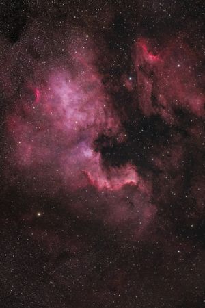 The North America Nebula (NGC 7000) and the Pelican Nebula (IC 5070) are two neighboring hydrogen emission regions in the constellation Cygnus, often photographed together because they form a spectacular, expansive cosmic landscape.
