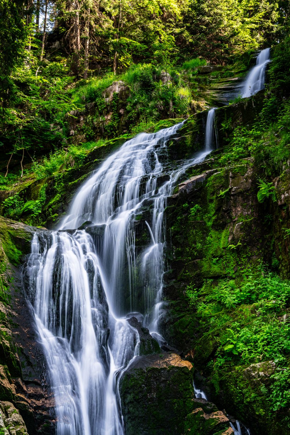 Kamieńczyk Waterfall, one of the most picturesque natural sites in the Karkonosze Mountains. The water cascades gently over layered rock formations, creating a soft, silky flow effect. Surrounded by lush, vibrant greenery, the scene captures the raw tranquility and wild beauty of the forest. A place where time seems to slow down—as the sound of rushing water fills the mountain air.