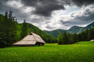 Jaworzynka Valley — a wide green valley surrounded by forests and meadows, where traditional wooden shepherd huts still stand.