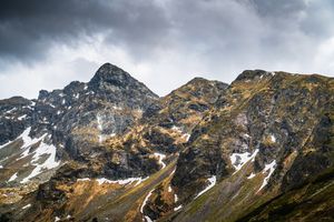 Raw, rocky peaks of the Tatra Mountains captured in the dramatic light of an approaching storm. Dark, heavy clouds contrast with the sharp lines of the mountains and the remaining patches of snow. The natural color palette — the grays of the rock, muted greens, and rusty tones of the slopes — emphasizes the wilderness and power of the landscape. A dynamic, energetic scene showcasing the unpredictable nature of high mountains.